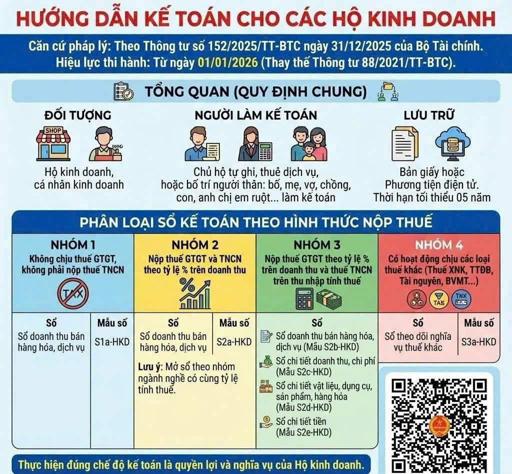 Ngày 31/12/2025, Bộ Tài chính ban hành Thông tư 152/2025/TT-BTС hướng dẫn kế toán cho các hộ kinh doanh, cá nhân kinh doanh có hiệu lực từ ngày 01/01/2026.